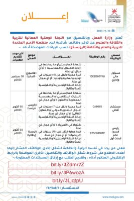 تعلن وزارة العمل بالتنسيق مع اللجنة الوطنية العمانية للتربية والثقافة والعلوم عن توفر عدد من الوظائف الشاغرة لدى منظمة الأمم المتحدة للتربية والعلوم والثقافة (اليونسكو) حسب البيانات الموضحة أدناه :-