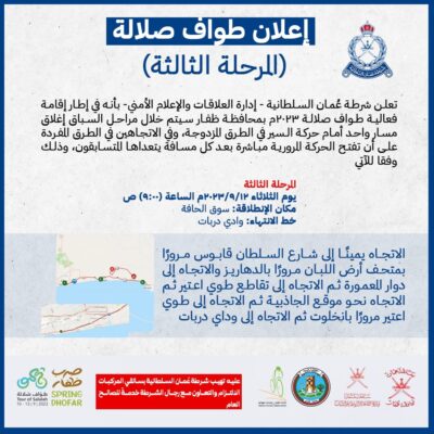 اعلنت شرطة عُمان السلطانية – إدارة العلاقات والإعلام الأمني- بأنه في إطار إقامة فعالية طواف صلالة ۲۰۲۳م بمحافظة ظفار سيتم خلال مراحل السباق إغلاق مسار واحد أمام حركة السير في الطرق المزدوجة، وفي الاتجاهين في الطرق المفردة على أن تفتح الحركة المرورية مباشرة بعد كل مسافة يتعداها المتسابقون، وذلك وفقا للآتي