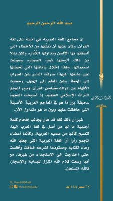 ولكن بدلا من ذلك ألبستها ثوب الصواب؛ فبهذا صرفت الناس عن الصواب إلى الخطأ، كأنما رأوا أن العربية التي جعلها الله وعاء لكتابه أفلست حتى احتاجت إلى استجداء غيرها”.