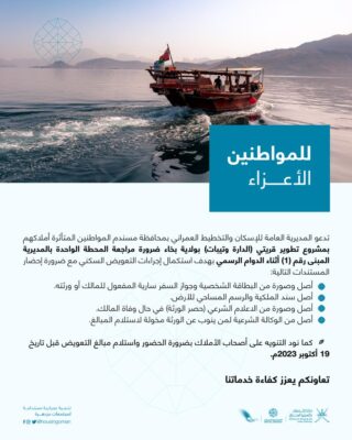 دعت المديرية العامة للإسكان والتخطيط العمراني بمحافظة مسندم المواطنين المتأثرة أملاكهم بمشروع تطوير قريتي (الدارة) وتيبات بولاية بناء ضرورة مراجعة المحطة الواحدة بالمديرية المبنى رقم 1 أثناء الدوام الرسمي بهدف استكمال إجراءات التعويض السكني مع ضرورة إحضار المستندات الموضحة ادناه: