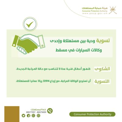 اعلنت هيئة حماية المستهلك عبر حسابها الرسمي على موقع التواصل الاجتماعي اكس عن تسوية ودية بين مستهلكة وإحدى وكالات السيارات في مسقط.