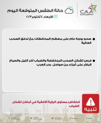 اعلنت هيئة الأرصاد الجوية عبر حسابها الرسمي على موقع التواصل الاجتماعي اكس عن حالة الطقس المتوقعة اليوم الأربعاء ٤ أكتوبر ٢٠٢٣ صحو بوجه عام على معظم المحافظات مع تدفق السحب العالية.