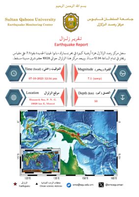 سجل مركز رصد الزلازل التابع لجامعة السلطان قابوس هزة أرضية كبيرة في بحر بسمارك ، بابوا غينيا الجديدة بقوة 7.1 على مقياس