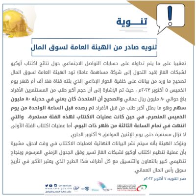 اصدرت الهيئة العامة لسوق المال بيانًا حول ما يتداول على مواقع التواصل الإجتماعي عن اكتتاب أوكيو لشبكات الغاز