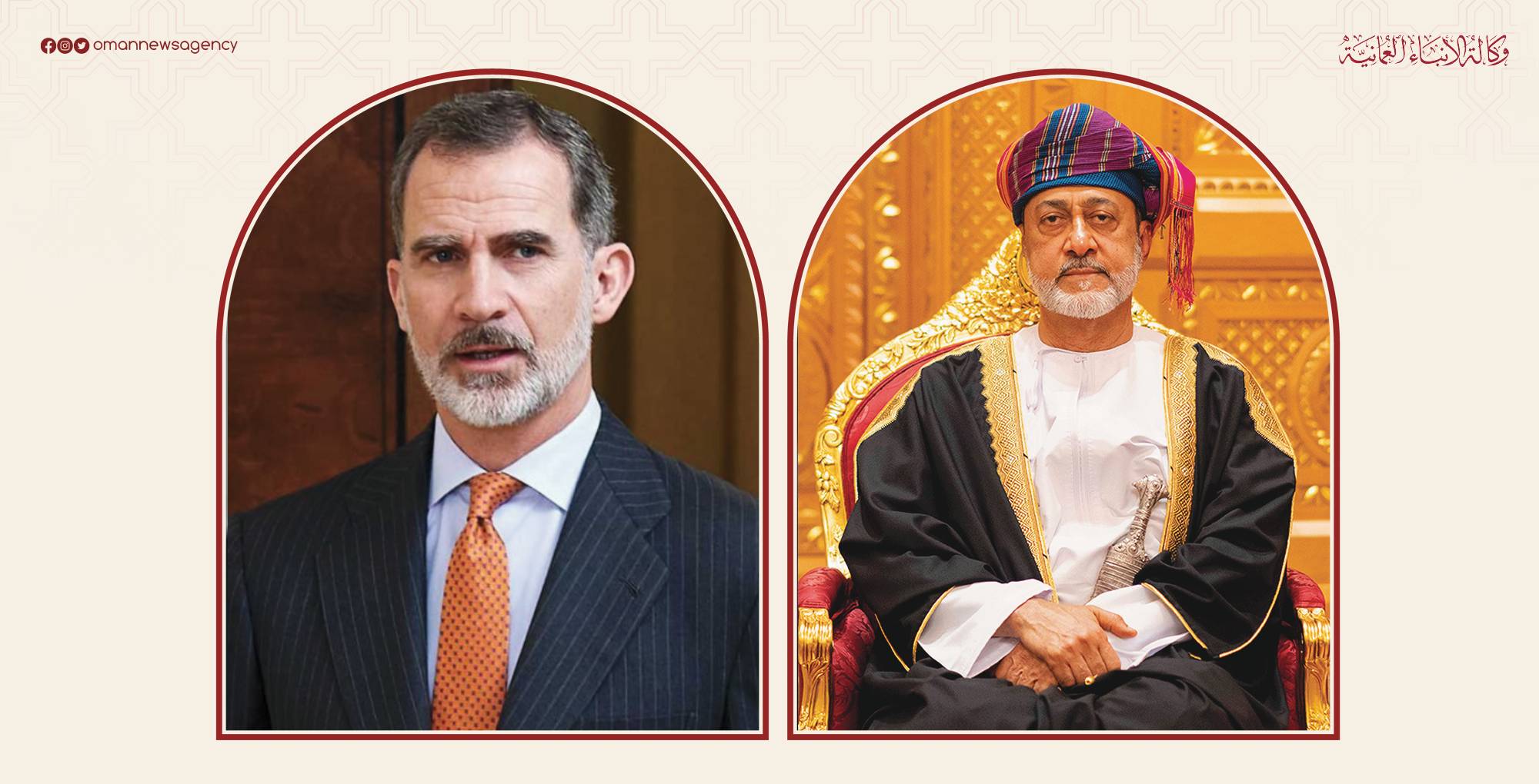 تلقى حضرة صاحب الجلالة السلطان هيثم بن طارق المعظم /حفظه الله ورعاه/ اتصالًا هاتفيًّا من جلالة الملك/ فيليـبي السادس ملك مملكة إسبانيا، استعرض العاهلان خلاله العلاقات الثنائية المتينة بين البلدين الصديقين وسبل تطويرها في مختلف المجالات، إضافة إلى تبادل وجهات النظر حول عدد من القضايا الإقليمية والدولية ذات الاهتمام المشترك.