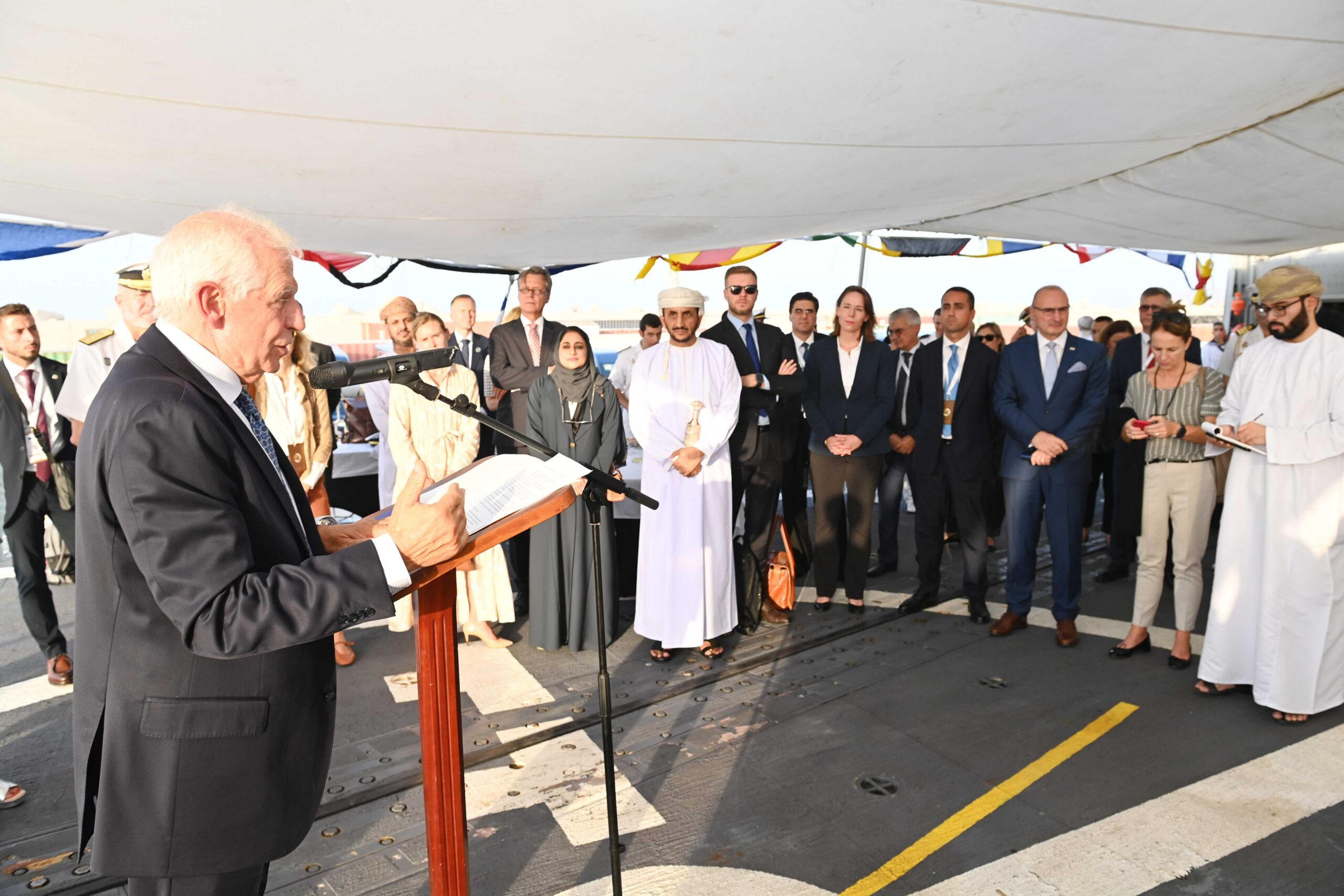 من جانبه أكَّد سعادة الشيخ خليفة بن علي الحارثي وكيل وزارة الخارجية للشؤون السياسية، الذي رافق الوفد خلال جولتهم على متن الفرقاطة على عمق العلاقات العُمانية الأوروبية، مشيرًا إلى أنَّ سلطنة عُمان تعمل دائمًا مع مختلف الدول الشقيقة والصديقة لتسهيل التوصل إلى السلام والأمن المنشودين.