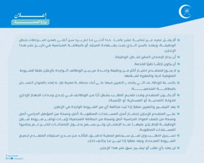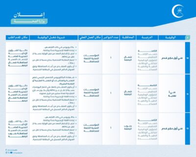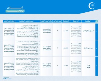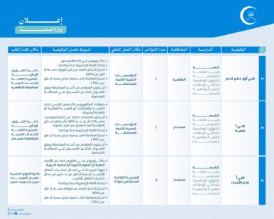وهج الخليج - مسقط أعلنت وزارة الصحة بالشراكة مع وزارة العمل عن توفر عدد (١٧) وظيفة شاغرة، حسب البيانات المحددة والشروط الموضحة أمام كل وظيفة: