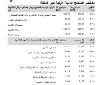 أعلن بنك مسقط، المؤسسة المالية الرائدة في السلطنة، عن النتائج المالية الأولية غير المدققة للتسعة أشهر المنتهية في 30 سبتمبر 2023م، حيث حقق البنك ربحاً صافياً قدره (158.88) مليون ريال عماني مقارنة ً بالربح الصافـــي البالغ (148.29) مليون ريال عماني للفترة ذاتها من العام 2022م، بزيادة نسبتها (%7.1).