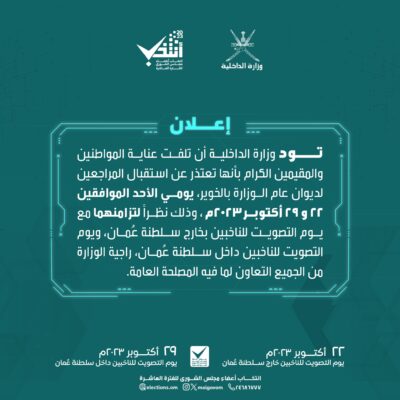 وأضافت أن ذلك نظراً لتزامنهما بيوم التصويت للناخبين بخارج سلطنة عُمان ويوم التصويت للناخبين داخل سلطنة عُمان.