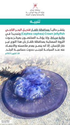 أعلنت وزارة الثروة الزراعية والسمكية وموارد المياه عبر حسابها الرسمي على موقع التواصل الاجتماعي اكس تنبيهًا عن انتشار قنديل البحر التاجي بمحافظة ظفار وتحديداً في ولاية مرباط.