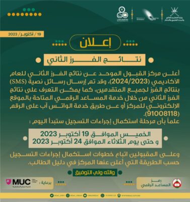 أعلن مركز القبول الموحد عن نتائج الفرز الثاني للعام الأكاديمي (2024/2023) ، وقد تم إرسال رسائل نصية (SMS) بنتائج الفرز لجميع المتقدمين ، كما يمكن التعرف على نتائج الفرز الثاني من خلال خدمة المساعد الرقمي المتاحة بالموقع الإلكتروني للمركز أو عن طريق خدمة الواتس آب على الرقم .(91008118) علماً بأن مرحلة استكمال إجراءات التسجيل ستبدأ اليوم الخميس الموافق 19 اكتوبر 2023 وحتى يوم الثلاثاء الموافق 24 اكتوبر 2023 .