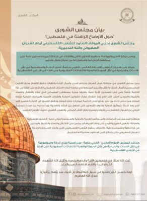 اصدر مجلس الشورى العماني بيانًا حول الأوضاع الراهنة في “فلسطين” ، حيا فيه الموقف الصامد للشعب الفلسطيني أمام العدوان الصهيوني .