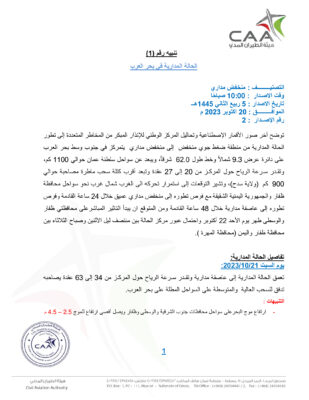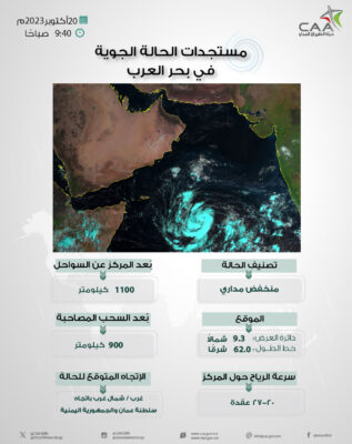 حيث توضح آخر صور الأقمار الإصطناعية وتحاليل المركز الوطني للإنذار المبكر من المخاطر المتعددة إلى تطور الحالة المدارية من منطقة ضغط جوي منخفض إلى منخفض مداري يتمركز في جنوب وسط بحر العرب على دائرة عرض 9.3 شمالاً وخط طول 62.0 شرقاً، ويبعد عن سواحل سلطنة عمان حوالي 1100 كم وتقدر سرعة الرياح حول المركز من 20 إلى 27 عقدة وتبعد أقرب كتلة سحب ماطرة مصاحبة حوالي 900 كم (ولاية سدح).
