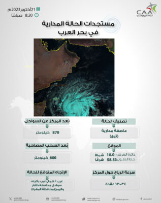 وهج الخليج - مسقط قالت الأرصاد الجوية العمانية عبر حسابها الرسمي على منصة إكس آخر مستجدات الحالة المدارية في بحر العرب. تصنيف الحالة عاصفة مدارية اطلق عليها اسم " تيج " وتبعد 870 كم عن سواحل السلطنة .