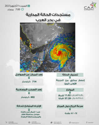 قالت الارصاد الجوية العمانية في آخر تحديث للحالة الجوية في بحر العرب تحول العاصفة المدارية ” تيج” الى اعصار مداري من الدرجة الاولى ويبعد حوالي 714 كم عن سواحل ظفار .