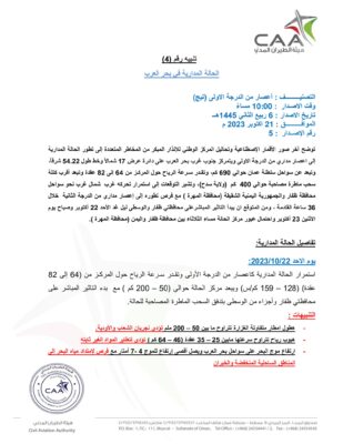 اصدرت الارصاد الجوية العمانية التقرير رقم 4 حول الحالة المدارية في بحر العرب فيما يلي نصه : توضح آخر صور الأقمار الإصطناعية وتحاليل المركز الوطني للإنذار المبكر من المخاطر المتعددة إلى تطور الحالة المدارية إلى اعصار مداري من الدرجة الأولى ويتمركز جنوب غرب بحر العرب على دائرة عرض 17 شمالاً وخط طول 54.22 شرقاً، وتبعد عن سواحل سلطنة عمان حوالي 690 كم، وتقدر سرعة الرياح حول المركز من 64 إلى 82 عقدة وتبعد أقرب كتلة سحب ماطرة مصاحبة حوالي 400 كم (ولاية سدح)، وتشير التوقعات إلى استمرار تحركه غرب شمال غرب نحو سواحل محافظة ظفار والجمهورية اليمنية الشقيقة (محافظة المهرة مع فرص تطوره إلى إعصار مداري من الدرجة الثانية خلال 36 ساعة القادمة ، ومن المتوقع ان يبدأ التاثير المباشر على محافظتي ظفار والوسطى ليل غد الأحد 22 أكتوبر وصباح يوم الاثنين 23 أكتوبر واحتمال عبور مركز الحالة مساء الثلاثاء بين محافظة ظفار واليمن (محافظة المهرة ).