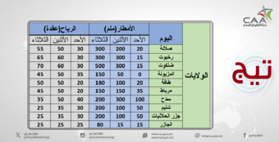 كميات الأمطار وسرعات الرياح المتوقعة للولايات المتوقع تأثرها بالحالة المدارية تيج