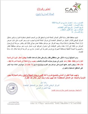 أصدرت الأرصاد الجوية العمانية التحذير رقم 3 للحالة الجوية على بحر العرب حيث تشهد محافظة ظفار بداية التأثير المباشر للحالة المدارية بتدفق كتل من السحب الماطرة متفاوتة الغزارة وتشير تحاليل المركز الوطني للإنذار المبكر من المخاطر المتعددة إلى تمركز الحالة المدارية جنوب غرب بحر العرب على دائرة عرض 13.3 شمالاً وخط طول 54.4 شرقاً، ويبعد المركز عن سواحل سلطنة عمان حوالي 350 كم، وتقدر سرعة الرياح حول المركز من 100 إلى 112 عقدة. كما تشير التوقعات إلى استمرار تحركها غرب شمال غرب نحو سواحل محافظة ظفار والجمهورية اليمنية الشقيقة (محافظة المهرة) مع فرص تطورها إلى إعصار مداري من الدرجة الرابعة خلال 12 ساعة القادمة.