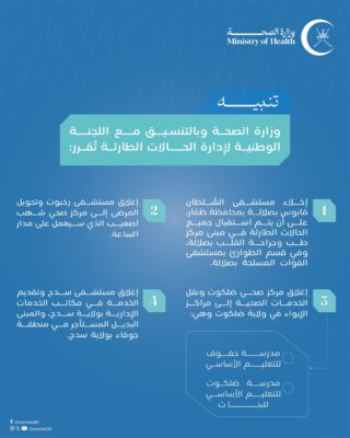 قررت وزارة الصحة وبالتنسيق مع اللجنة الوطنية لإدارة الحالات الطارئة إخلاء وإغلاق المستشفيات والمراكز الصحية الموضحة أدناه :
