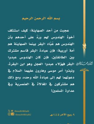 قال سماحة الشيخ احمد بن حمد الخليلي مفتي عام سلطنة عمان عبر حسابه الرسمي على موقع التواصل الاجتماعي اكس ” عجبت من أحد الصهاينة؛ كيف استنكف أخوة الهندوس لهم ورَدَّ بأنهم عُبَّاد البقر بينما الصهاينة أمة أوربية؛ فإن عبادة البقر قاسم مشترك بين الطائفتين، وهم مشتركون في المغالاة في العنصرية وفي عداوة المسلمين!