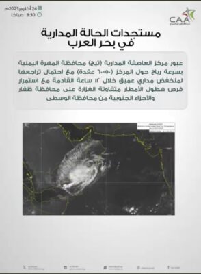 اوضحت الارصاد الجوية العمانية آخر مستجدات الحالة المدارية في بحر العرب ” تيج” عبور مركز العاصفة المدارية تيج محافظة المهرة اليمنية مع مع احتمال تراجعها إلى منخفض مداري عميق خلال 12ساعة القادمة