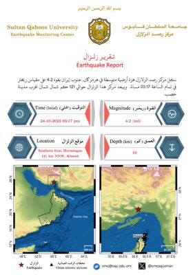 سجل مركز رصد الزلازل بجامعة السلطان قابوس هزة أرضية  في هرزمگان جنوب إيران , بقوة 4.2 على مقياس ريختر في تمام الساعة 03:17 مساء. ويبعد مركز هذا الزلزال حوالي 121 كم شمال غرب مدينة خصب.