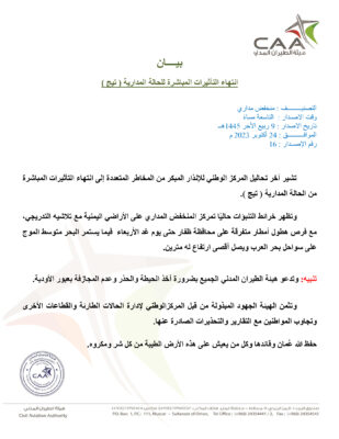 انتهت التأثيرات المباشرة للحالة المدارية (تيج) ، وتظهر خرائط التنبؤات تمركز المنخفض المداري على الأراضي اليمنية مع تلاشيه التدريجي وفرص هطول أمطار متفرقة على محافظة ظفار حتى يوم غد الأربعاء.