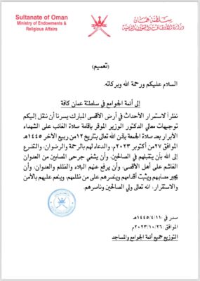وجه وزير الاوقاف والشؤون الدينية أئمة الجوامع في سلطنة عمان بإقامة صلاة الغائب على الشهداء الأبرار في أرض الأقصى المبارك بعد صلاة الجمعة غداً والدعاء لهم بالرحمة والرضوان، والتضرع إلى الله بأن يتقبلهم في الصالحين، وأن يشفي جرحى المصابين من العدوان الغاشم على أهل الأقصى، وأن يرفع عنهم البلاء والظلم والعدوان، وأن يجبر مصابهم ويثبت أقدامهم وينصرهم على من ظلمهم، وينعم عليهم بالأمن والاستقرار انه تعالى ولي الصالحين وناصرهم .