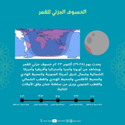 تشهد سماء سلطنة عمان يوم (٢٨-٢٩) أكتوبر خسوف جزئي للقمر ويشاهد من أوروبا وآسيا وأستراليا وأفريقيا وأمريكا الشمالية وشمال شرق أمريكا الجنوبية والمحيط الهادي والمحيط الأطلسي والمحيط الهندي والقطب الشمالي والقطب الجنوبي.