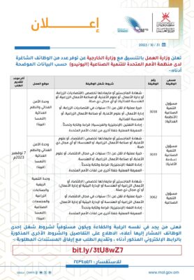 أعلنت ⁧‫وزارة العمل‬⁩ بالتنسيق مع وزارة الخارجية عن توفر عدد من الوظائف الشاغرة لدى منظمة الأمم المتحدة للتنمية الصناعية (اليونيدو) ، حسب البيانات المحددة. للتسجيل والاطلاع يُرجى استخدام الرابط التالي