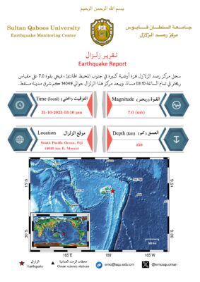 وهج الخليج - مسقط سجل مركز رصد الزلازل هزة أرضية كبيرة في جنوب المحيط الهادئ ، فيجي بقوة 7.0 على مقياس ريختر في تمام الساعة 03:10 مساءً. ويبعد مركز هذا الزلزال حوالي 14049 كم شرق مدينة مسقط.