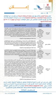 أعلنت وزارة العمل وبالتنسيق مع سفارة السلطنة بالدوحة عن توفر عدد من الوظائف الشاغرة بوزارة المواصلات بدولة قطر الشقيقة وذلك حسب البيانات الموضحة أدناه، فعلى من يجد في نفسه الرغبة والكفاءة ويكون مستوفياً لشروط شغل إحدى الوظائف المشار إليها، تقديم طلبه مع إرفاق السيرة الذاتية عبر البريد الإلكتروني:
