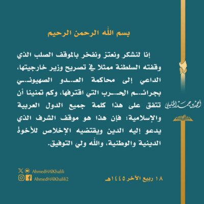 قال سماحة الشيخ احمد بن حمد الخليلي عبر حسابه الرسمي على موقع التواصل الاجتماعي اكس ” نشكر ونعتز ونفخر بموقف السلطنة الداعي إلى محاكمة العدو الصهيوني بجرائـم الحرب التي اقترفها، فهذا موقف الشرف الذي تقتضيه الأخوة الدينية والوطنية”.