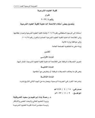 أصدرت كلية العلوم الشرعية قرار رقم ٢٠٢٣/٤ بتعديل بعض أحكام اللائحة الداخلية لكلية العلوم الشرعية استنادا إلى المرسوم السلطاني رقم ۲۰۱٤/٣٥ بإنشاء كلية العلوم الشرعية وإصدار نظامها وإلى اللائحة الداخلية لكلية العلوم الشرعية الصادرة بالقرار رقم ٢٠١٨/٣٥ وإلى موافقة وزارة المالية وبناء على ما تقتضيه المصلحة العامة.