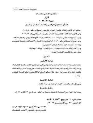 أصدر المجلس الأعلى للقضاء قرار رقم ٢٠٢٣/٣٢٢ بشأن التحول الرقمي لخدمات الكتاب بالعدل استنادا إلى قانون الكتاب بالعدل الصادر بالمرسوم السلطاني رقم ٢٠٠٣/٤٠، وإلى قانون المعاملات الإلكترونية الصادر بالمرسوم السلطاني رقم ٢٠٠٨/٦٩، وإلى المرسوم السلطاني رقم ٦٤ / ۲۰۲۰ بإنشاء مركز الدفاع الإلكتروني وإصدار نظامه، وإلى المرسوم السلطاني رقم ۹۰ / ۲۰۲۰ بإنشاء وزارة النقل والاتصالات وتقنية المعلومات وتحديد اختصاصاتها واعتماد هيكلها التنظيمي وإلى القرار رقم ۲۰۲۲/۱۰۳ بإصدار استراتيجية البيانات الوطنية وبناء على ما تقتضيه المصلحة العامة.
