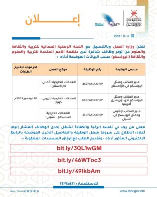 أعلنت ⁧‫وزارة العمل‬⁩ وبالتنسيق مع اللجنة الوطنية العمانية للتربية والثقافة والعلوم عن توفر وظائف شاغرة لدى منظمة الأمم المتحدة للتربية والعلوم والثقافة (اليونسكو) وذلك حسب البيانات الموضحة، للاطلاع والتسجيل من خلال الروابط الإلكترونية التالية: