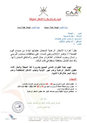 اصدرت الارصاد الجوية العمانية تنبيه رقم (1) بغزارة الامطار حيث من المحتمل هطول الأمطار الغزيرة ابتداء من صباح اليوم الجمعة 17 نوفمبر 2023م وحتى المساء، على محافظات مسندم والبريمي وشمال وجنوب الباطنة والظاهرة وجبال الحجر والمناطق المجاورة لها وقد تمتد لتشمل محافظة مسقط في قادم الوقت.