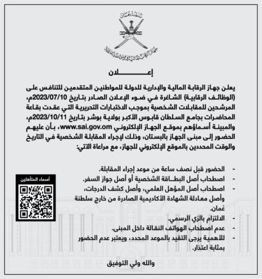 اعلن جهاز الرقابة المالية والإدارية للدولة للمواطنين المتقدمين للتنافس على الوظائف الرقابية الشاغرة في ضوء الإعلان الصادر بتاريخ 2023/07/10م، المرشحين للمقابلات الشخصية بموجب الاختبارات التحريرية التي عقدت بقاعة المحاضرات بجامع السلطان قابوس الأكبر بولاية بوشر بتاريخ 2023/10/11م، والمبينة أسماؤهم بموقع الجهاز الإلكتروني :