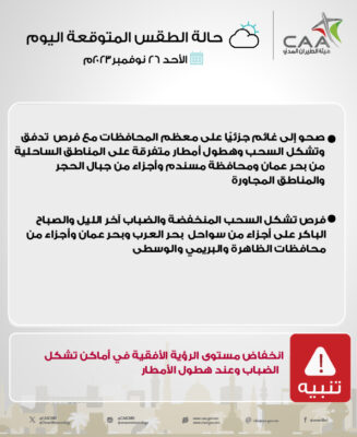 اعلنت هيئة الأرصاد الجوية عبر حسابها الرسمي على موقع التواصل الاجتماعي تويتر عن حالة الطقس المتوقعة اليومالأحد ٢٦ نوفمبر ٢٠٢٣م.