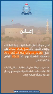 اعلنت شرطة عمان السلطانية بأنه يُمنع وقوف المركبات على جانبّي الطريق من ولاية منح إلى قلعة نزوى بمحافظة الداخلية يوم غدٍ الثلاثاء الموافق 28/11/2023م.