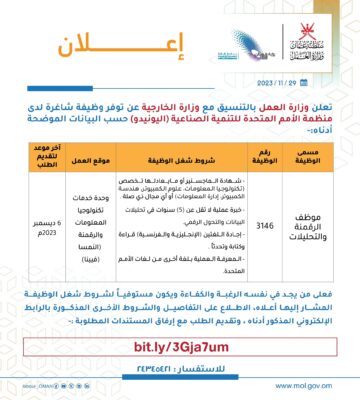 اعلنت وزارة العمل بالتنسيق مع وزارة الخارجية عن وجود فرصة شاغرة لدى منظمة الأمم المتحدة للتنمية الصناعية(اليونيدو)، فعلى من يجد في نفسه الرغبة ويكون مستوفيا للشروط عليه الاطلاع والتسجيل :