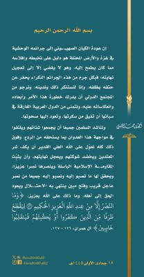 ونناشد المسلمين جميعا أن يجمعوا شتاتهم ويلتفوا في مواجهة هذا العدوان بما يستحقه من الردع، وفوق ذلك كله نعول على الله العلي القدير أن يكف شر المعتدين ويخضد شوكتهم ويعجل نهايتهم، وأن يثبت المقاومة الإسلامية الباسلة وينصرها نصرا عزيزا ويحقق لها ما تصبو إليه ونصبو إليه جميعا من نصر عاجل قريب وفتح مبين ينتهي به الاحتلال ويعود الحق إلى أهله، وما ذلك على الله بعزيز، وَمَا النَّصْرُ إِلَّا مِنْ عِندِ اللَّهِ الْعَزِيزِ الْحَكِيمِ لِيَقْطَعَ طَرَفًا مِنَ الَّذِينَ كَفَرُوا أَوْ يَكْبِتَهُمْ فَيَنقَلِبُوا خَابِبِينَ ﴾