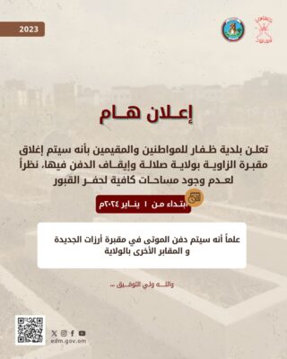 اعلنت بلدية ظفار عبر حسابها الرسمي على موقع التواصل الاجتماعي ” أكس ” للمواطنين والمقيمين بأنه سيتم إغلاق مقبرة الزاوية بولاية صلالة وإيقاف الدفن فيها، نظراً لعدم وجود مساحات كافية لحفر القبور ابتداء من 1 يناير ٢٠٢٤م