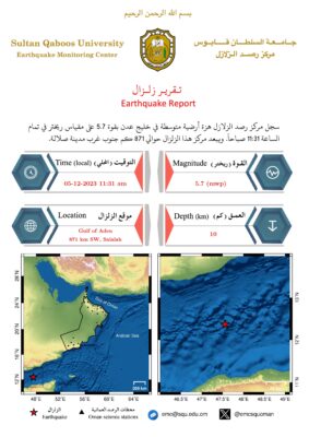 افاد مركز رصد الزلازل بجامعة السلطان قابوس اليوم،  إنه سجل هزة أرضية متوسطة في خليج عدن بقوة 5.7 على مقياس ريختر؛ حيث سجل الزلزال في تمام الساعة 11:31 صباحًا بالتوقيت المحلي .
