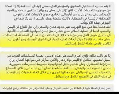 وقد قالت السفيرة الأميركية في مقطع تعريفي لها للشعب العماني” لقد عملنا معا على منع التهريب عبر حدود عمان والسعي إلى حل للنزاع في اليمن والمضي قدما في عملية السلام، نحن نتشارك مع عمان لمواجهة التحديات الأمنية في مضيق هرمز الذي يمر من خلاله 88 في المائة من النفط في المنطقة”، مضيفة” استضافت عمان منذ عام 1996 مركز أبحاث تحلية المياه في الشرق الأوسط، وهو أطول آلية تكامل إقليمي عاملة تشمل إسرائيل”.