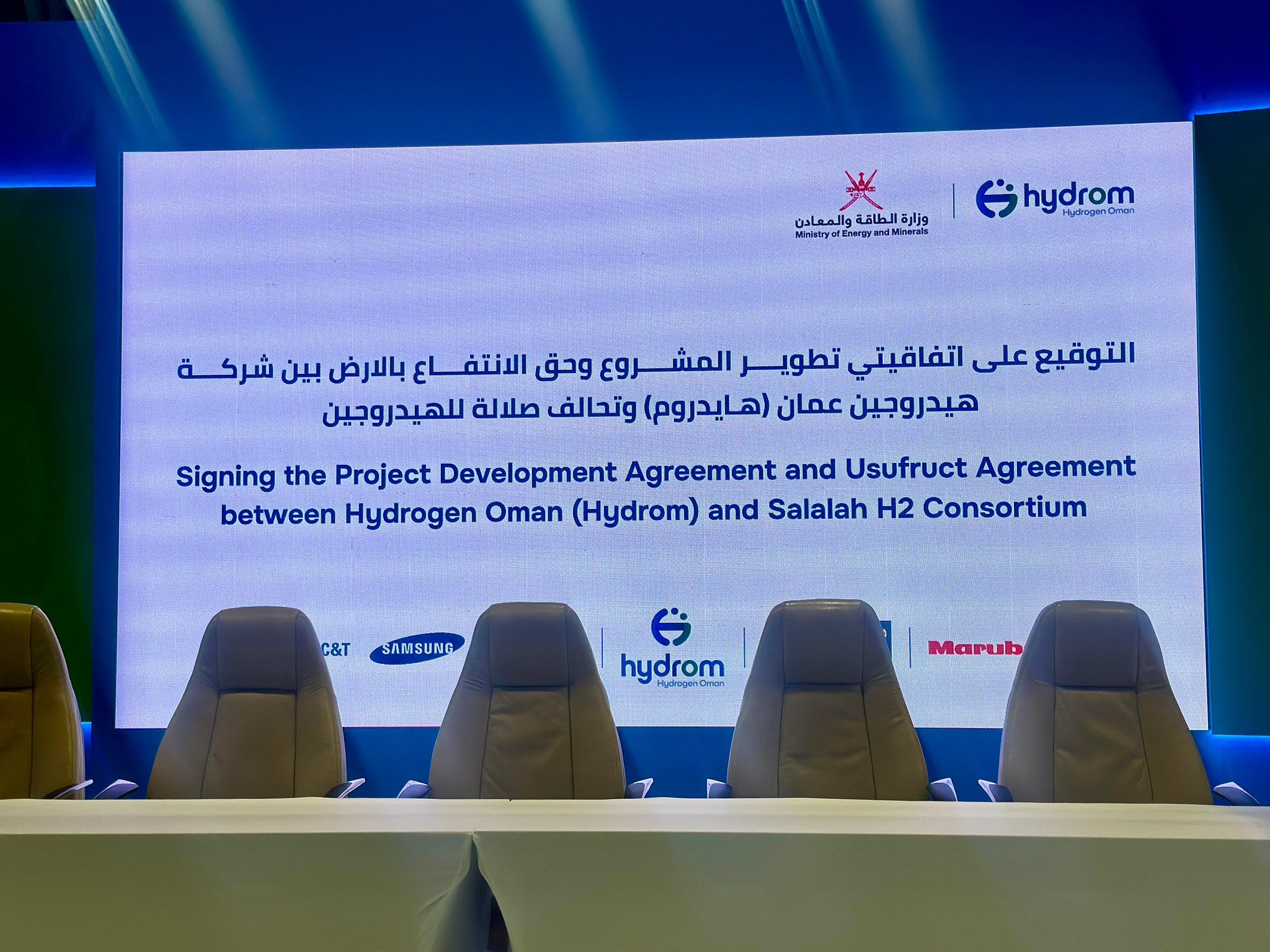 وبموجب اتفاقيتي تطوير مشروع وحق الانتفاع بالأرض مع “تحالف صلالة للهيدروجين الأخضر” الذي يجمع أطرافًا من سلطنة عُمان واليابان والإمارات وكوريا، من المقرر أن ينتج المشروع ما يزيد على 4 جيجاوات من الطاقة المتجددة لإنتاج الهيدروجين الأخضر ومعالجته إلى أمونيا خضراء للاستخدام المحلي بالإضافة إلى تصديرها إلى أسواق الأمونيا الخضراء العالمية.