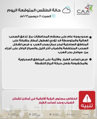 اعلنت هيئة الأرصاد الجوية عبر حسابها الرسمي على موقع التواصل الاجتماعي اكس عن حالة الطقس المتوقعة اليوم السبت ١٦ ديسمبر ٢٠٢٣م.