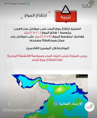 اعلنت هيئة الأرصاد الجوية عبر حسابها الرسمي على موقع التواصل الاجتماعي اكس تنبيه حول استمرار ارتفاع موج البحر على سواحل بحر العرب متوسط \ هائج الموج (٢٠٠-٢٠٥) متر وهادئ امتوسط الموج ( ١.٥ -٢.٥) متر على سواحل بحر عمان ومحافظة مسندم اليوم وخلال اليومين القادمين.
