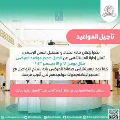 كما يود المستشفى طمأنة المرضى بأنه سيتم التواصل مع الجميع لإعادة جدولة مواعيدهم في أقرب فرصة.