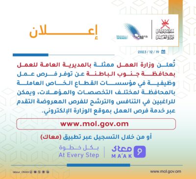 أعلنت وزارة العمل ممثلة بالمديرية العامة للعمل بمحافظة جنوب الباطنة عن توفر فرص عمل وظيفية في مؤسسات القطاع الخاص العاملة بالمحافظة لمختلف التخصصات والمؤهلات، للاطلاع والتسجيل في فرص العمل المعروضة يُرجى التقدم عبر خدمة فرص العمل ادناه :